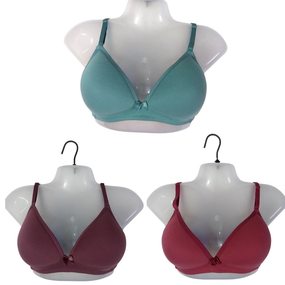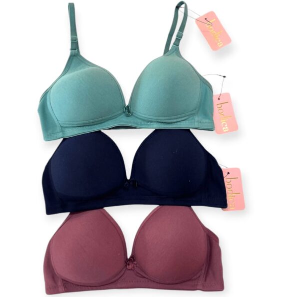 English: Upgrade your essentials with Bodicea’s Cotton Padded Bras. This mix-and-match combo lets you pick any 3 out of 6 gorgeous colors—teal, maroon, navy blue, black, mauve, and bright red. Made from breathable cotton with gentle padding and adjustable straps, these bras provide perfect comfort for daily wear. Available in sizes 30–36.