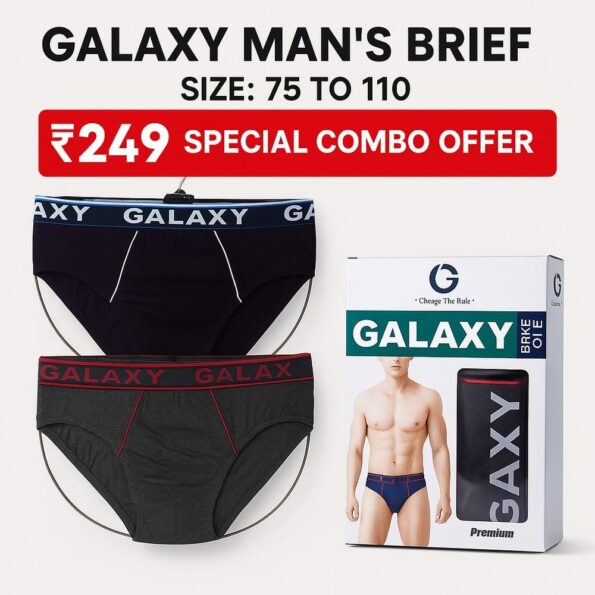 ગેલેક્સી મેન’સ બ્રીફ કોમ્બો – 2 બોક્સ લો 1 ફ્રી મેળવો. દરેક બોક્સમાં 2 કોટન બ્રીફ (કુલ 6 પીસ). આરામદાયક, સ્ટ્રેચ ફિટ અને આખો દિવસ તાજગીભર્યો અનુભવ.