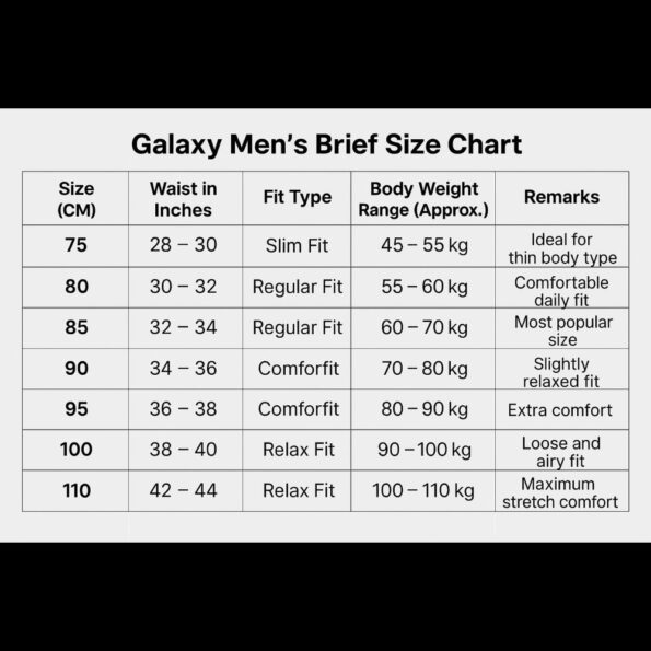 The Galaxy Men’s Cotton Comfort Brief is designed for men who value comfort, style, and durability. Crafted from 100% premium cotton, it offers maximum breathability and a soft touch that keeps you fresh all day. The elastic waistband with “GALAXY” branding provides a modern look and secure fit.
