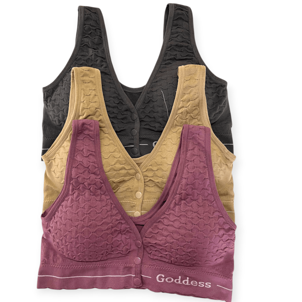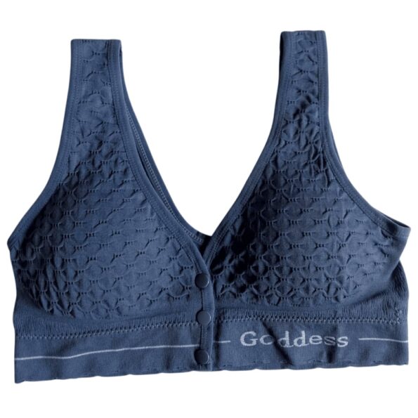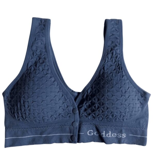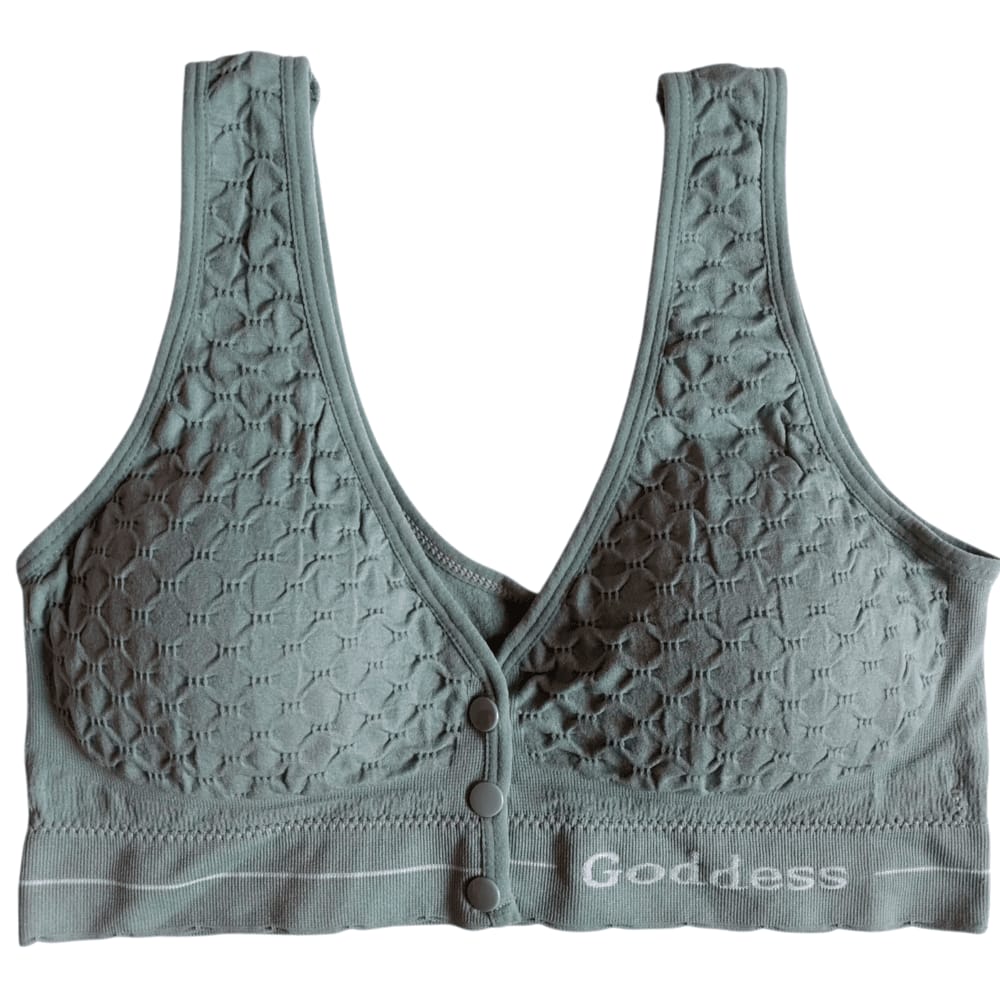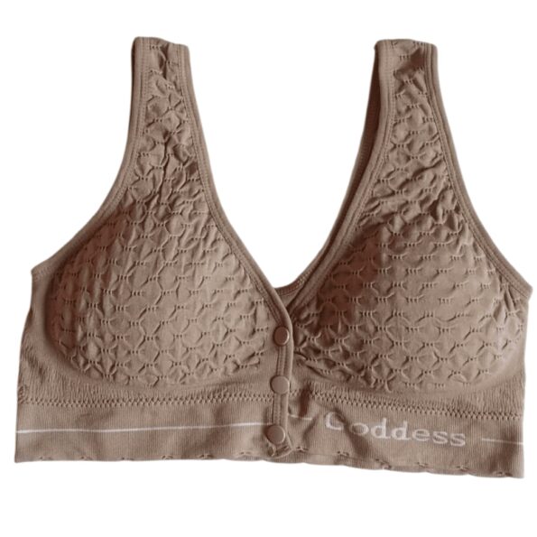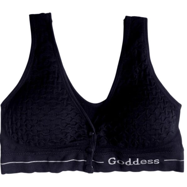Textured cotton bra with front-button closure and bold “Goddess” branding—crafted for daily comfort, stylish support, and confident wear.